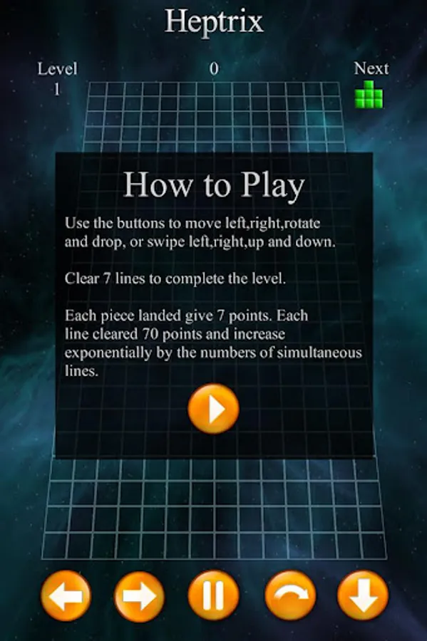 - Use the buttons to move left,right,rotate and drop, or swipe left,right,up and down.