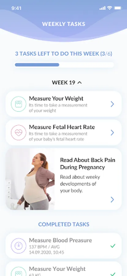 Maternity companion app enabling expectant mothers track, record and send physical and mental health vitals and stay educated with access to an extensive content library throughout their pregnancy journey.