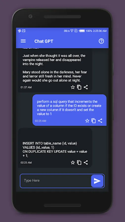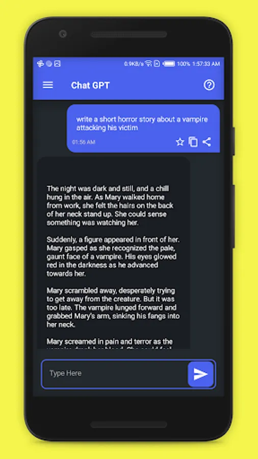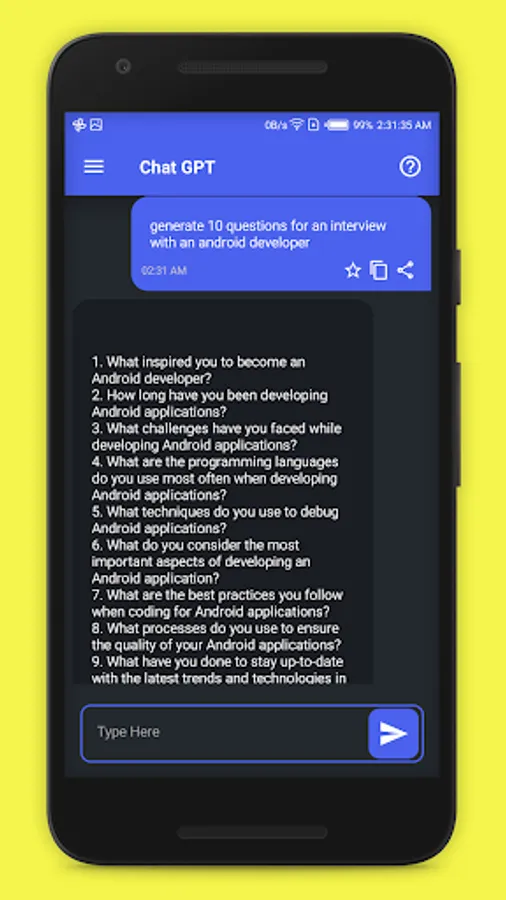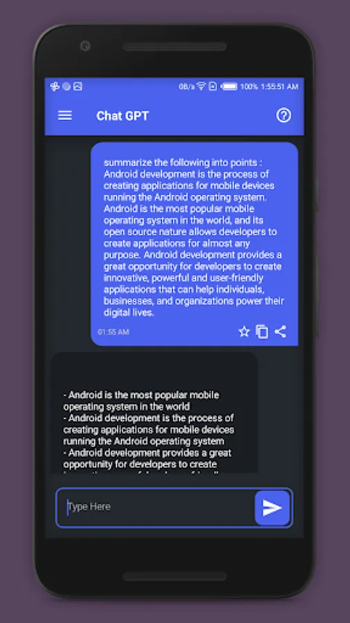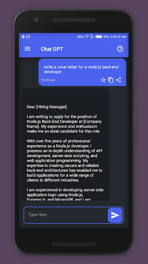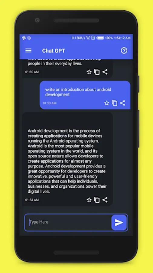 Hi there! I'm a Chat GPT (Generative Pre-trained Transformer) services application, and I'm here to help you with your conversations. I can provide assistance with a variety of topics, from small talk to technical questions. With me, you can have a realistic and natural conversation that is sure to help you make the most of your conversations. So download now and let's get started!