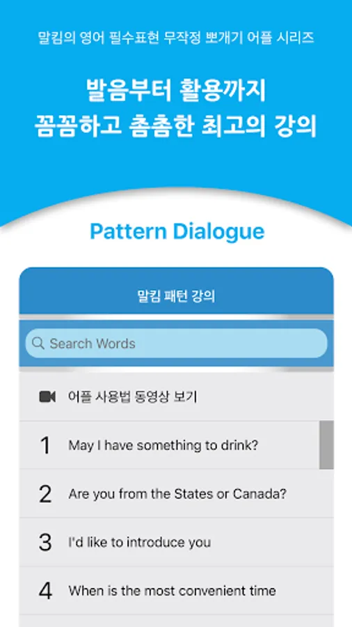 Thousands of international students and English conversation learners have successfully learned English through a lecture called Pogaegi with 1000 sentences of essential English expressions. Basically, this course is composed of pattern 500 and application 500, and the app is divided into three types of “pattern 500A, pattern 500B, application 500”, respectively. In addition, there are two applications, “Pattern Dialogue, Application Dialogue”, which can simulate these expressions so that they can be used in real life as the next step if they are sufficiently mastered through the previous three lecture applications.