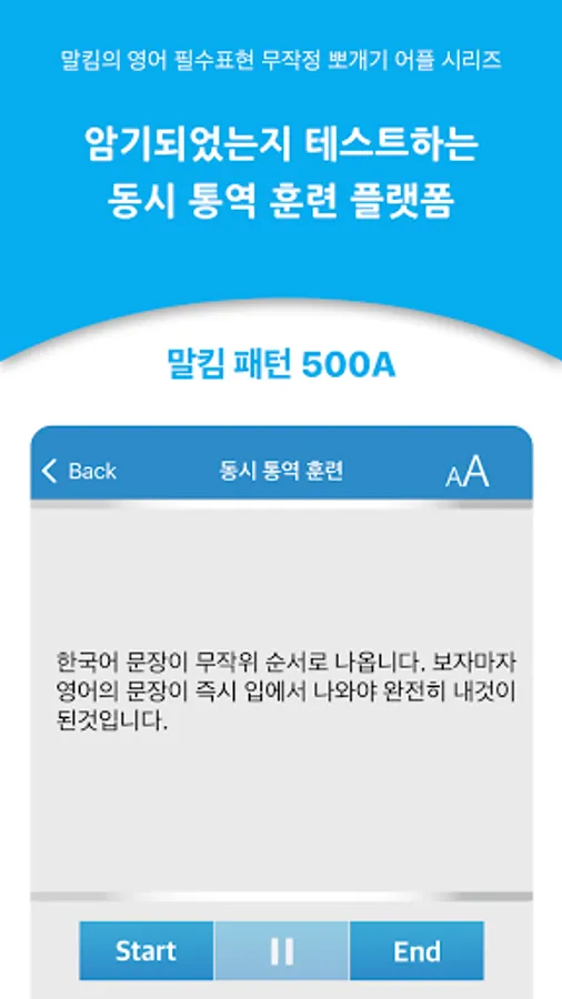 5. I have created a Test menu to make sure that the sentences are fully internalized into mine. If you select a range of lessons from the Test menu and press the Start button, the sentences in the specified lesson will be presented in Korean in random order. After a certain period of time, before the English sentence comes out, you have to be able to speak the sentence in English first. You should practice as much as you can.