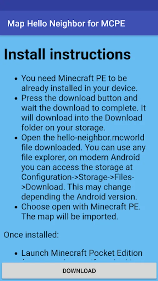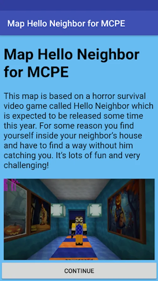 This application only includes the map Hello Neighbor for MCPE, requires the complete MCPE game, which can be downloaded in the store, to work.