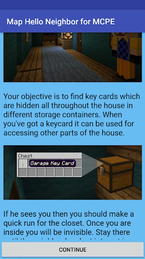 The mod consists of a map for MCPE that uses a spying and hiding game system. Hide from your neighbor, enter his house, search and find his secret that keeps so much.