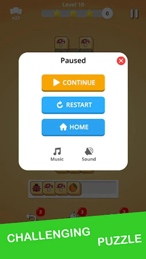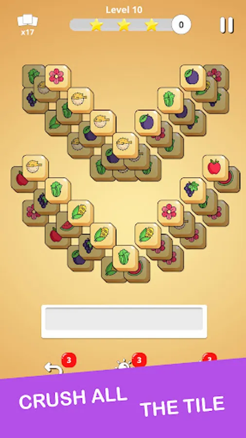 - Collect 3 identical tiles to match them and remove them from the puzzle.