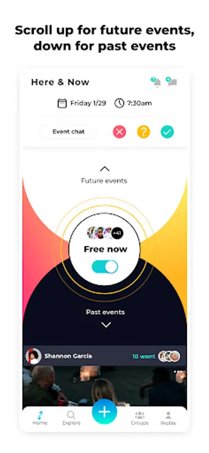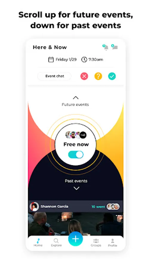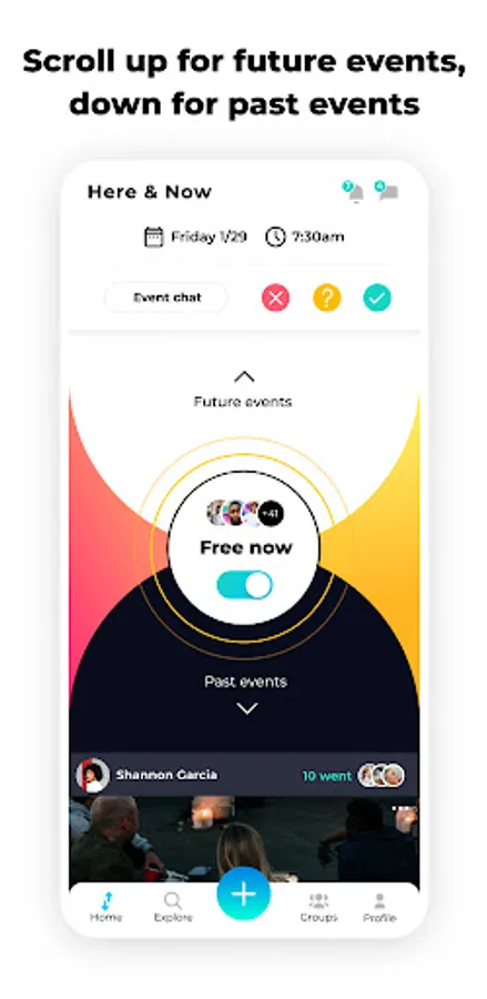Our platform is designed to help you connect with real people and communities around you, in person, and in real-time. With our unique feed, event planning tools, explore feature, and Free Now function, you can easily connect with real-world events and communities that align with your interests, helping you to discover new passions and connect with like-minded people.