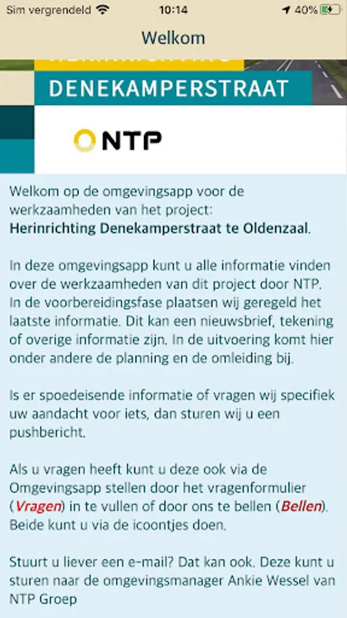 In this app you will find all information about the work of the project 'Refurbishment Denekamperstraat' in Oldenzaal. Important project information, the latest schedule and contact information are displayed . You can also leave questions, comments or complaints related to the project on this app.