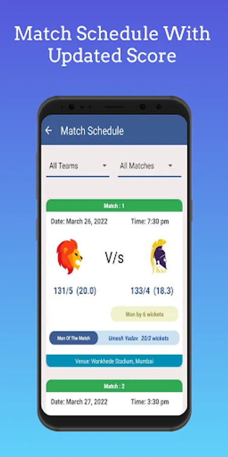 In CricScore App you can check match series schedules or matches of your favorite team or you can check match schedule timing of any match as well as live IPL cricket score of any match in just one tap.
