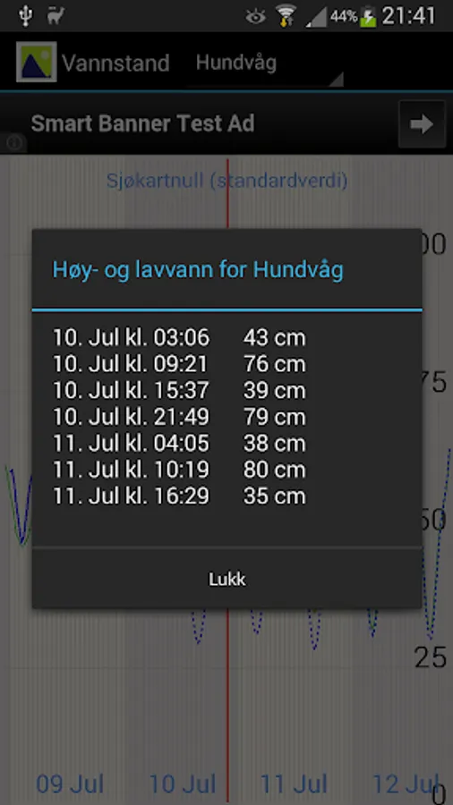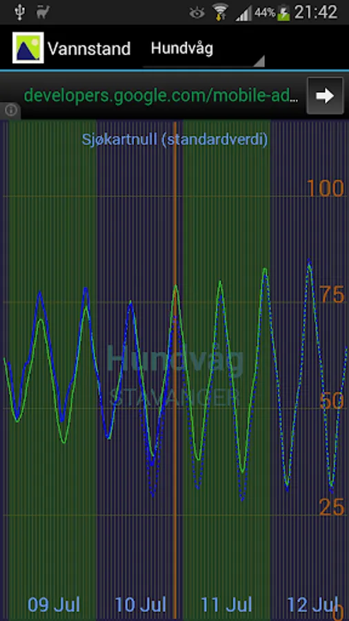 Viser tidevannstabell (spådd tidevann), observert vannstand og spådd vannstand fra norske havner, med data hentet fra Statens kartverk Sjø og yr.no.