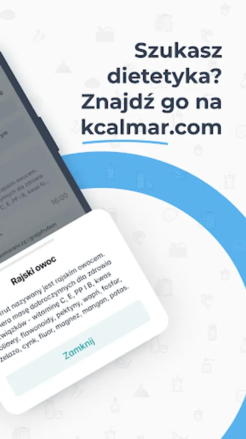 The application is dedicated to Patients led by dieticians using the Kcalmar.pro program. If you don't have your own dietitian yet, check out a sample version of the menu and with our help find a specialist for yourself, thanks to the dietician search engine at Kcalmar.com