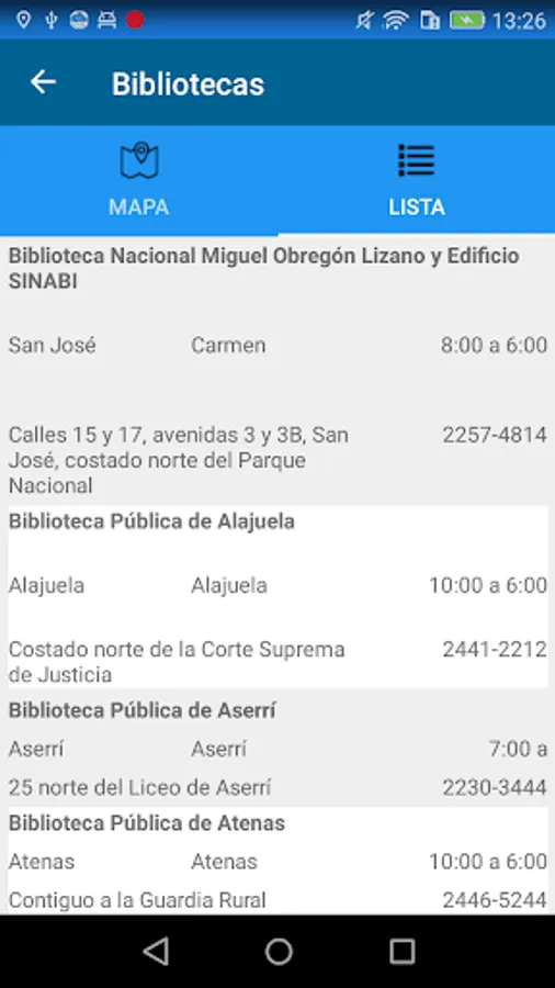 Libraries: Public libraries in Costa Rica made available to the public the most representative works of universal knowledge, develop efforts to promote the habit of reading and dissemination of information. They may use (but not share) accurate data on locations, including real-time geographic location of your device. The location does not leave the device, this location data is collected anonymously so that can not be used to personally identify you, and are used to show the location of the libraries closest to you.
