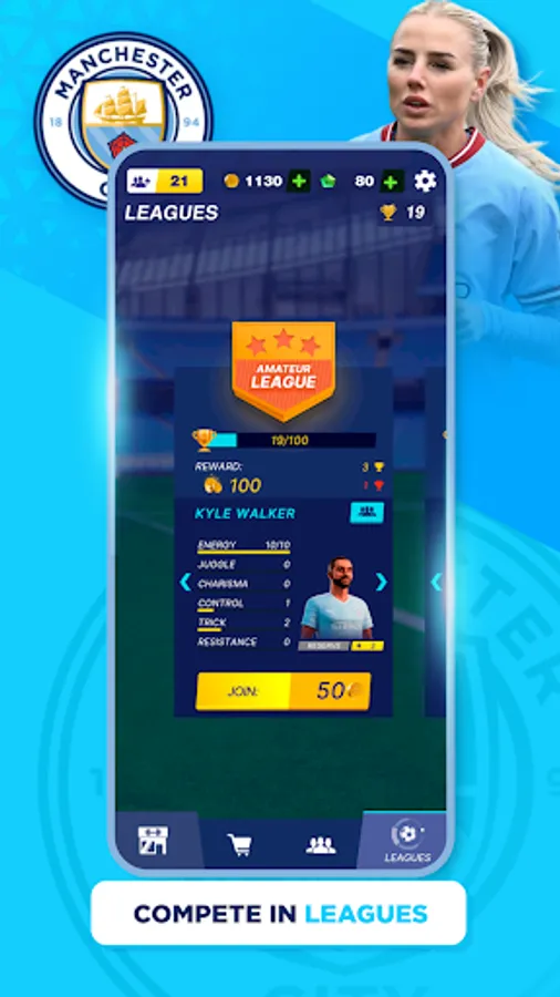 Start from zero and become the best Freestyle Academy! Compete against other players in the leagues and evolve the stars of your male and female teams! Play alongside Erling Haaland, Kevin De Bruyne, Riyad Mahrez, Philip Foden, Jack Grealish, Deyna Castellanos, Stephanie Houghton, Chloe Kelly, and many more athletes.