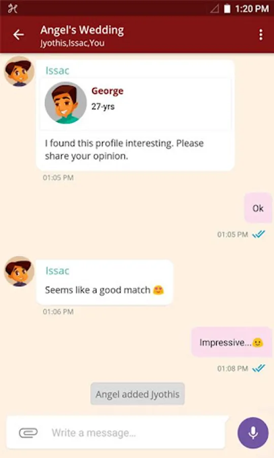 * Share, Suggest and discuss matching profiles, send custom messages over a safe and secure chat system