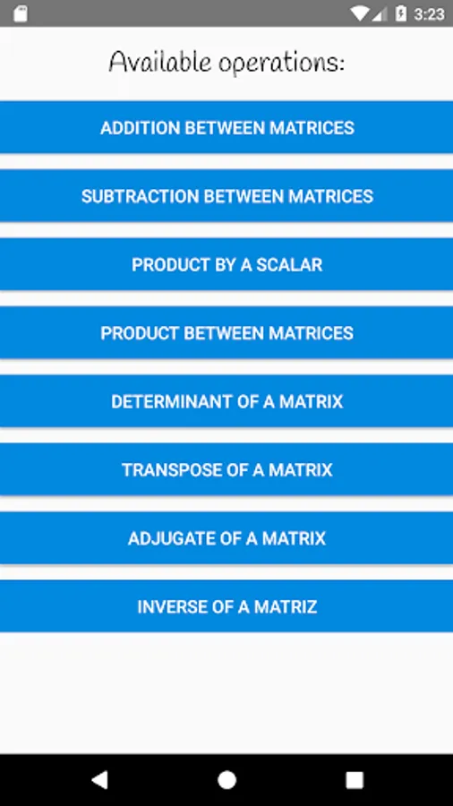 It is a matrix calculator programmed exclusively for Android so it makes calculations faster and more efficient. This application has the ability to perform the following operations: