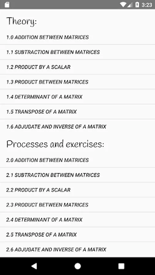 In order to help both the student and any person who wishes to learn about this numerical arrangement, the MatrizResol application contains theoretical content on all operations, their procedures and practical exercises on the operations that can be performed on a matrix or between matrices.