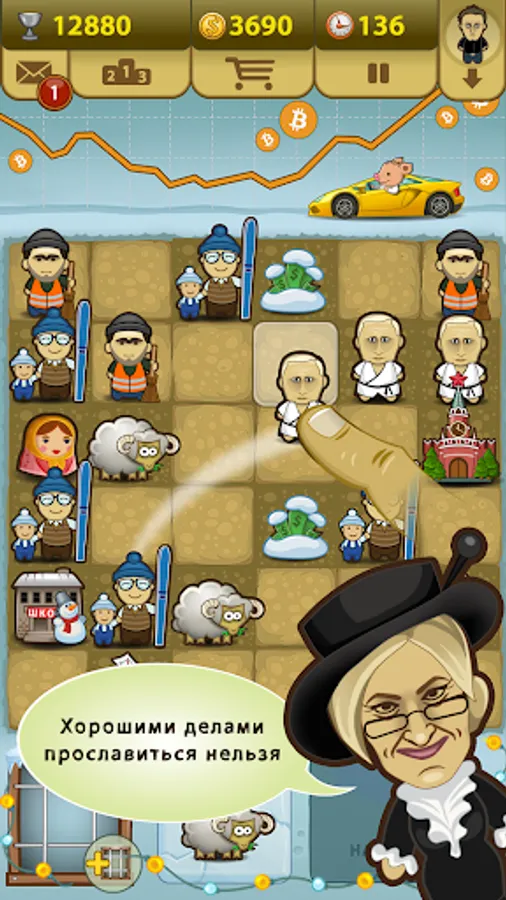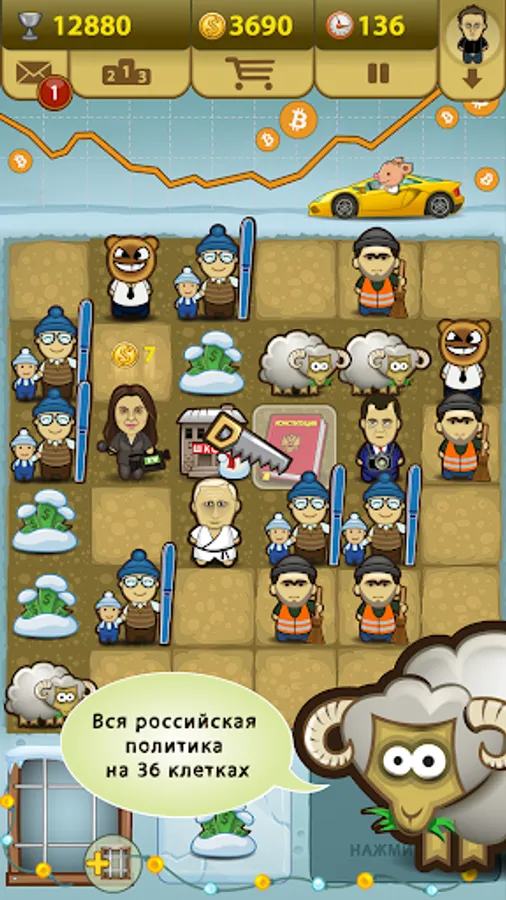 The aim of the game is simple. By placing the figures on a 6x6 grid, you will watch their "career growth". Three or more identical figures, placed side by side, will turn into one with a higher rank: Ministers form the Government, Deputies form the Duma, and so on. Your task is to stay in the political arena for the longest time. Even the seats of the Prime Minister or the President are not the ultimate goals in this game - DEMOCRACY will let you get even cooler! Saw in your hands!