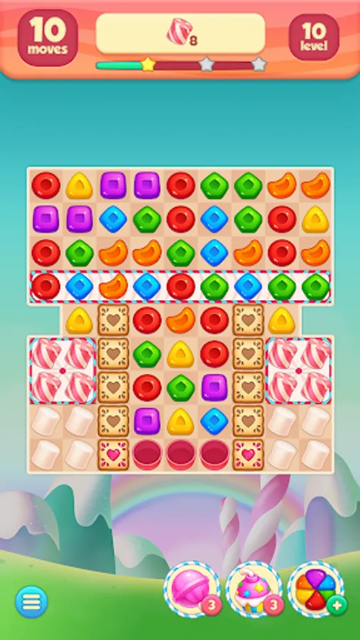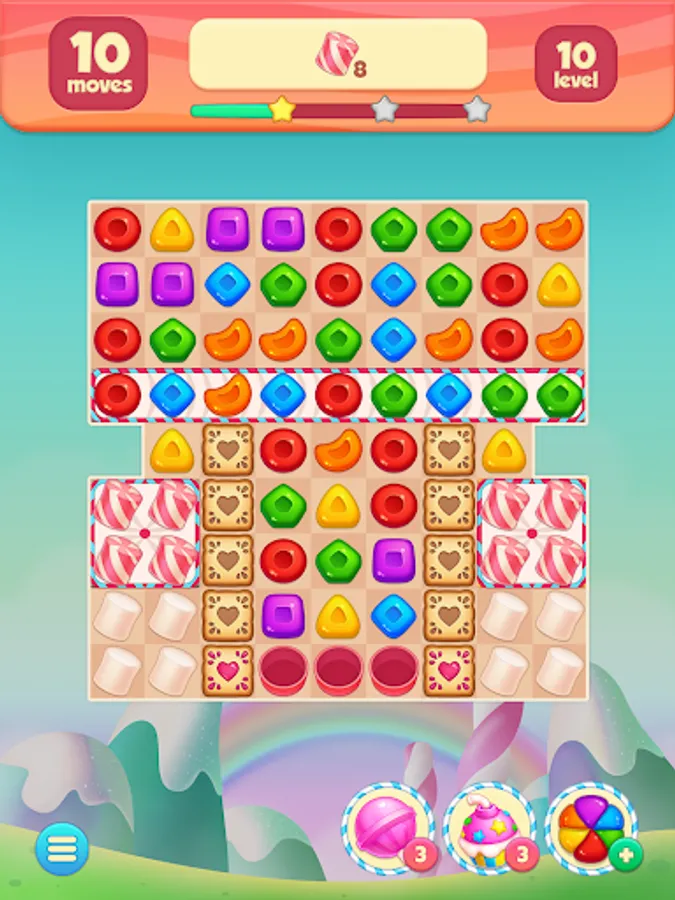 - Remove as many candies, cookies and marshmallows in as few moves as possible.