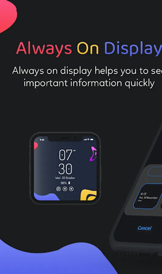 Always on display - Always On AMOLED keep your screen on all time when you lock your screen with information like date, time, battery percentage, notifications of calls and SMS on black background without touching screen always display on screen with less battery consumption. Mostly part of the screen is black except some information part so that screen look awesome when look on screen.