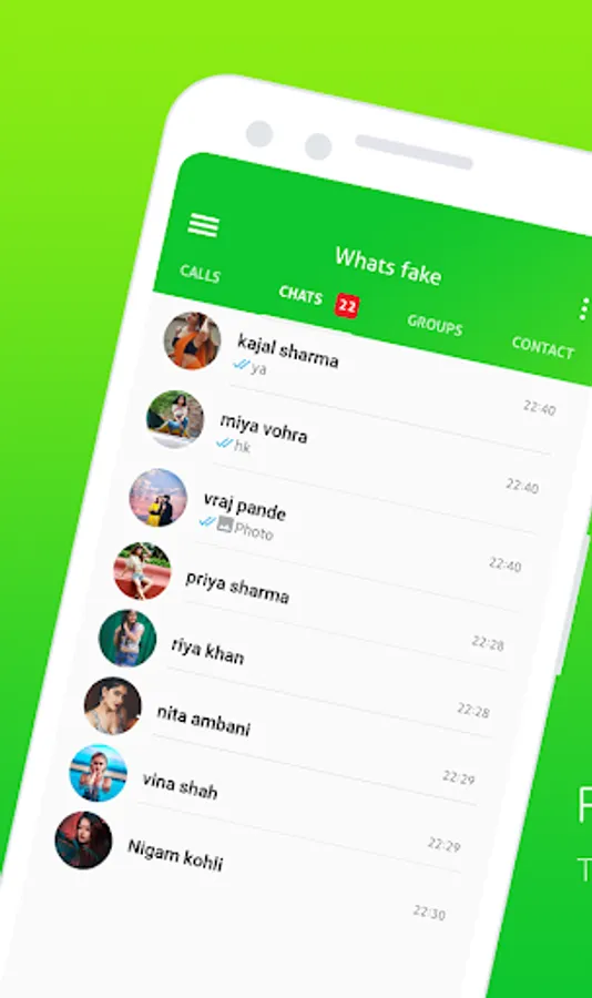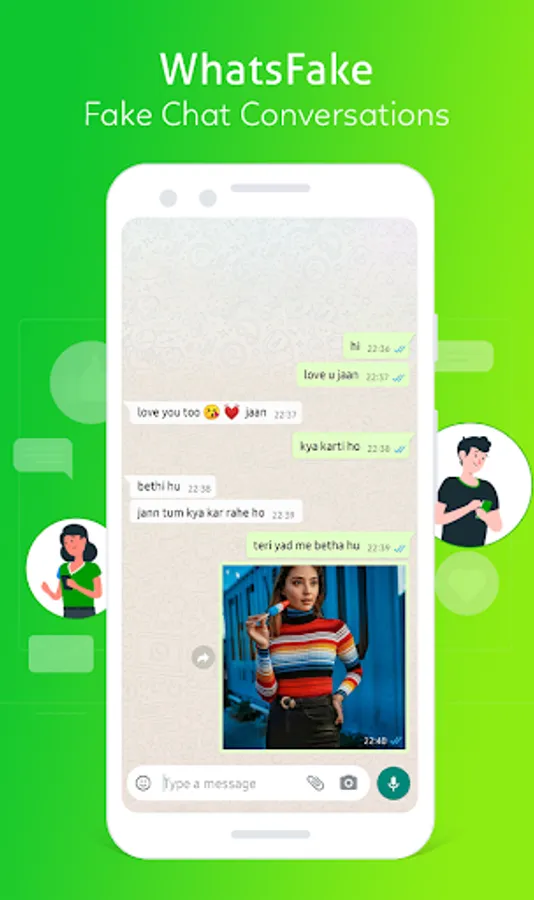 Fake Chat lets you create realistic mocks of chat conversations and share it with your friends. Create Whats Prank contacts and conversation and have fun with your friends and family.