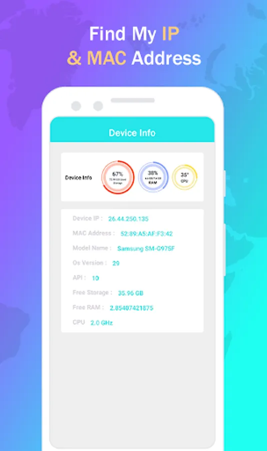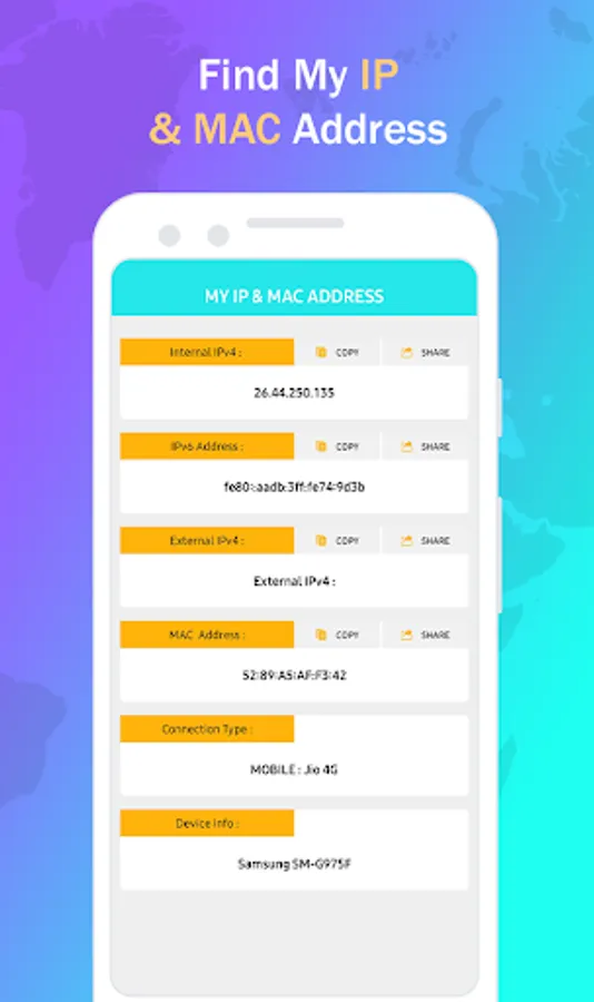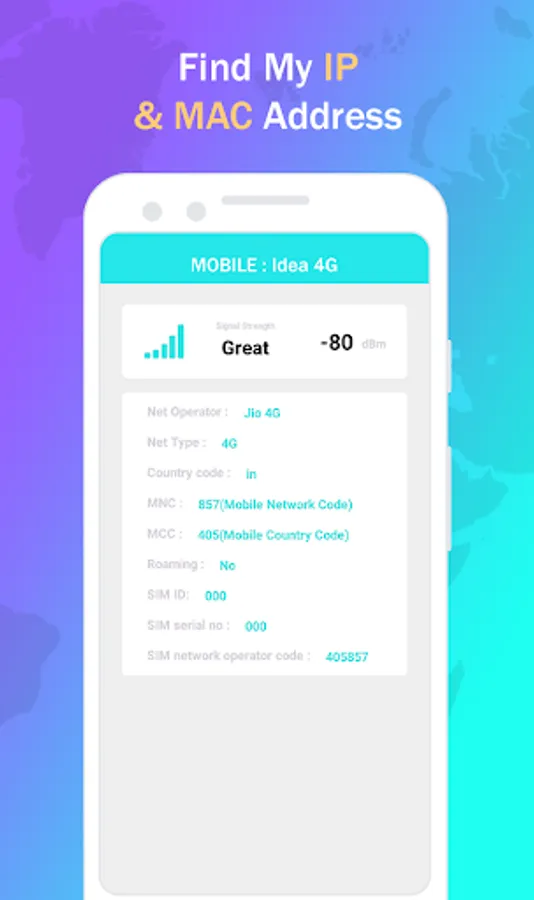 The app provides you information of IP Address and MAC address of your device or WIFI device your mobile is connected to. You get the following information with the help of this application.
