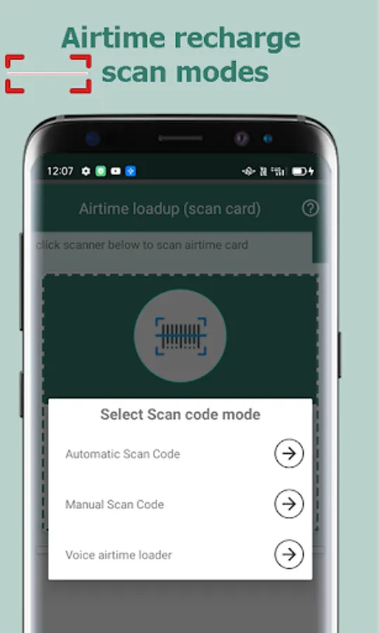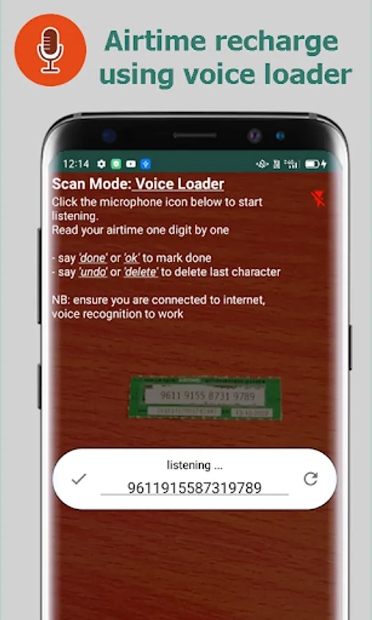 Recharge airtime using voice (speech to text recognition) or scan airtime card to recharge.