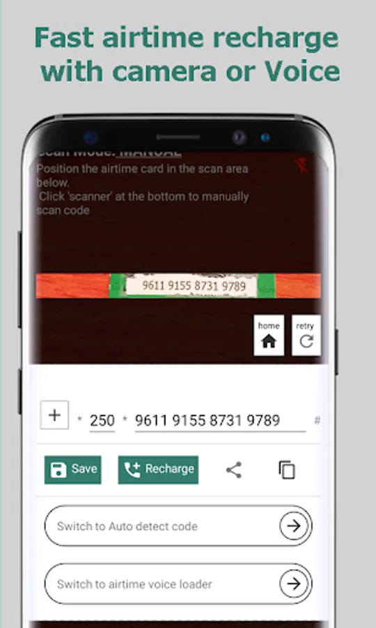 -Airtime camera recharge mobile card quickly and easily using either Auto scan detect code or manually scan airtime card code