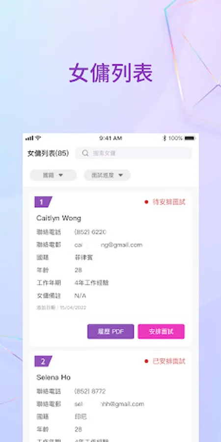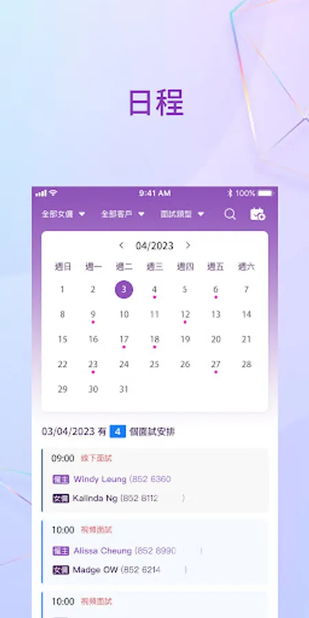 Through our app, you can easily manage customer information and maid information, effectively manage interview schedules, and conduct data analysis to optimize operations. You can also easily access your account information to stay on top of your business. Our management application will help you improve business efficiency and provide better services.