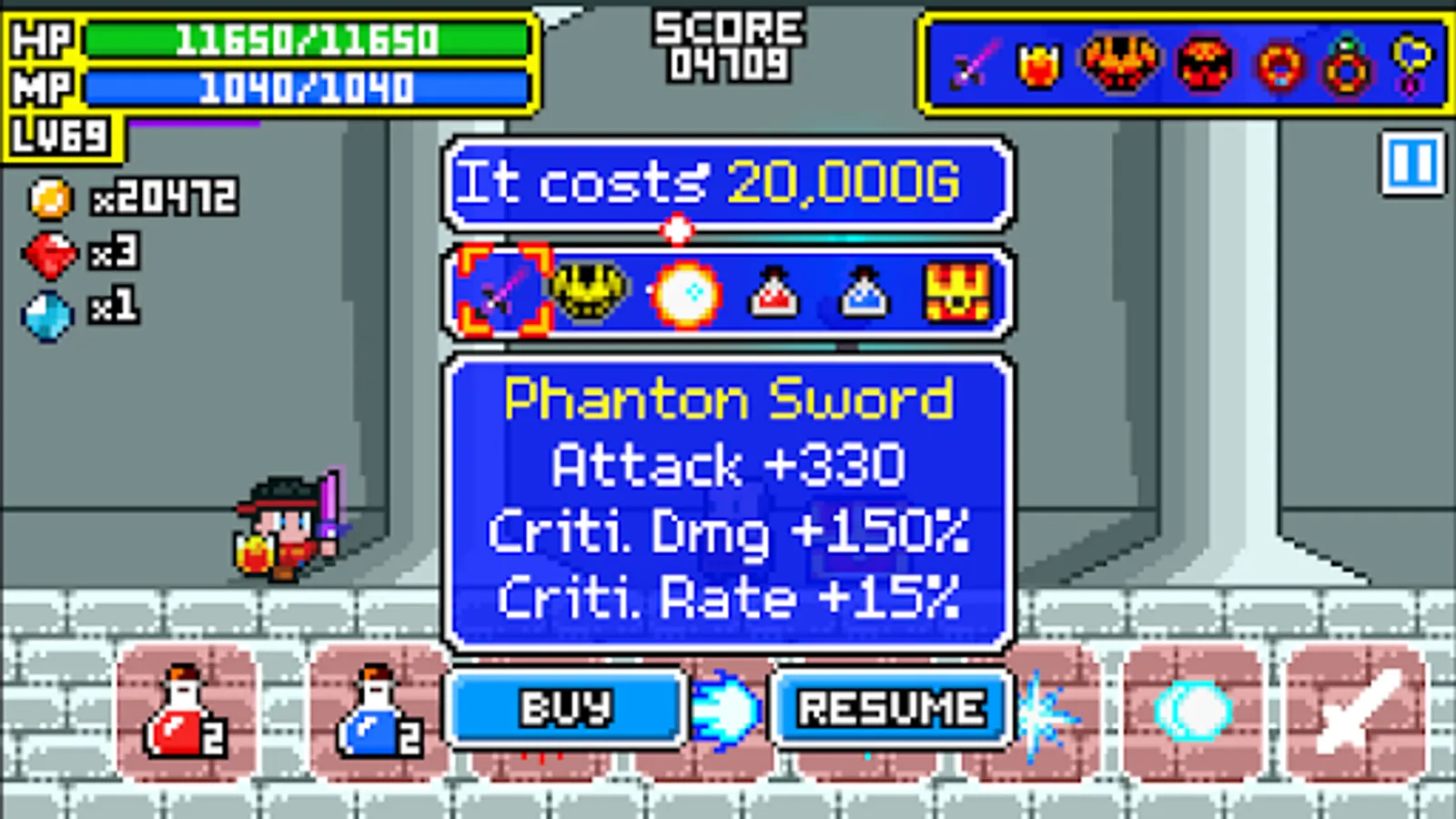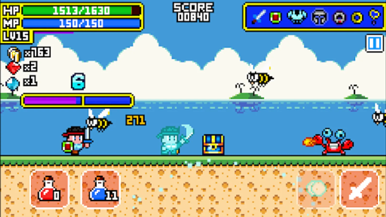 * All monsters and bosses have a chance to drop equipment, HP and MP potions and gems.