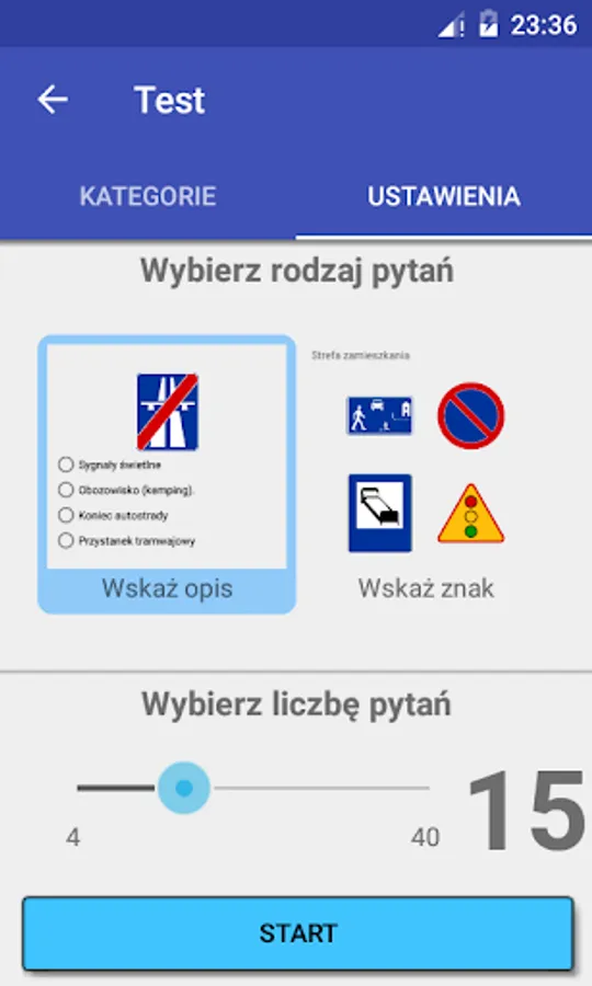 In addition, the user may test the knowledge of characters that can afford the same design by selecting categories of characters that would like to repeat, the number of questions and the test: to match the character to describe or fit the description of the mark.