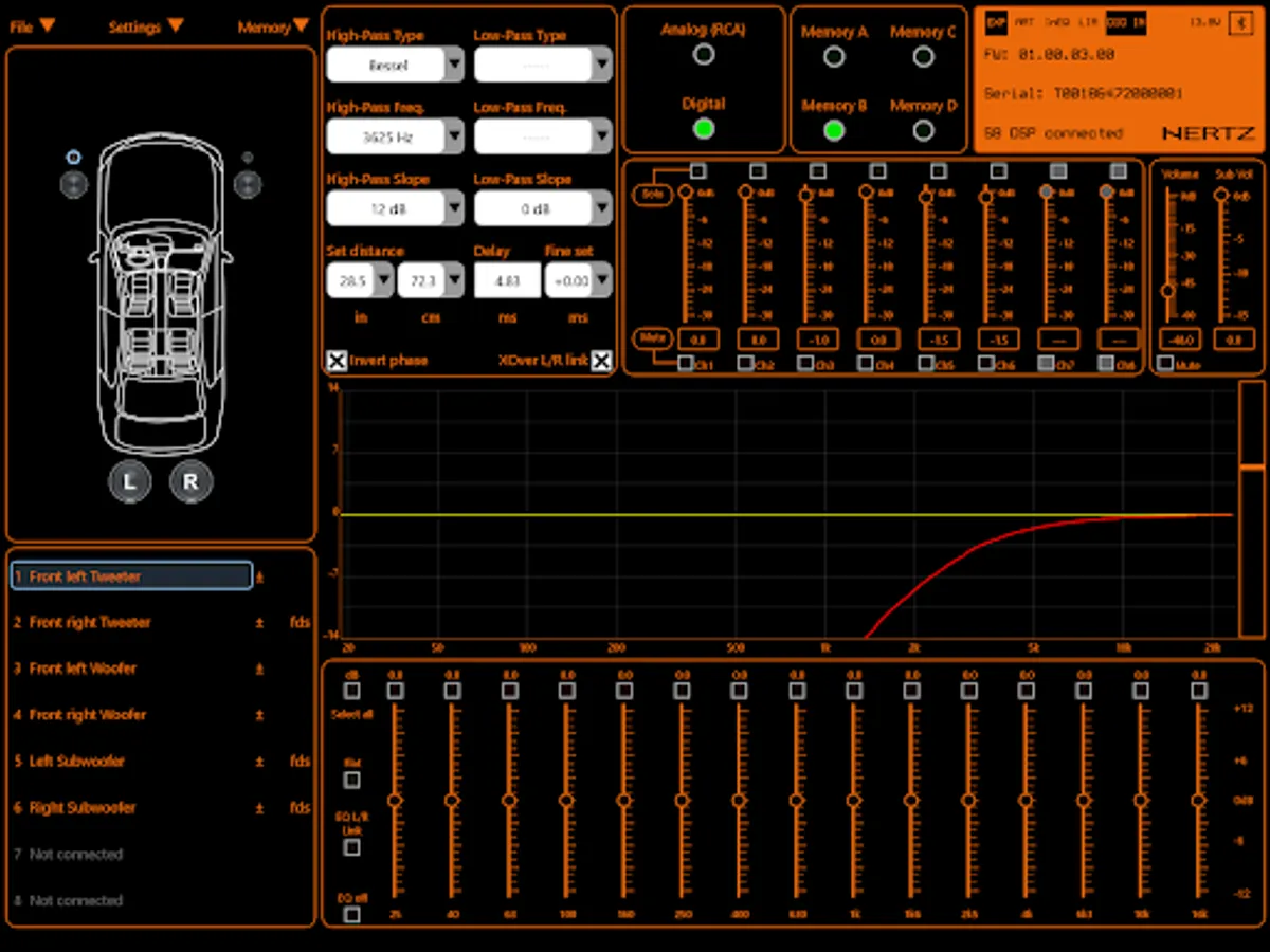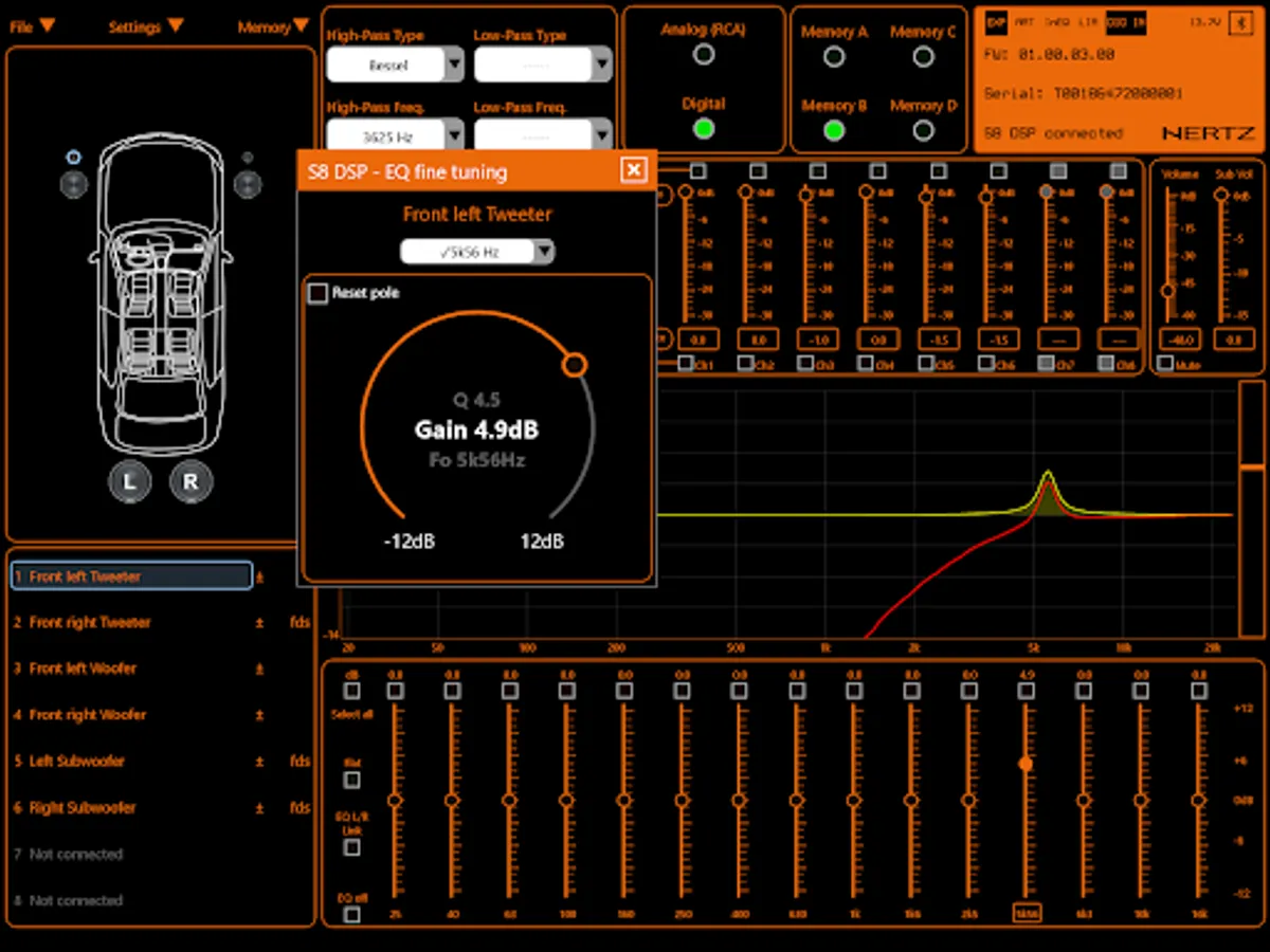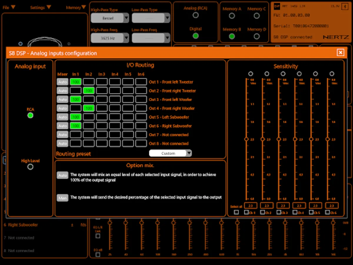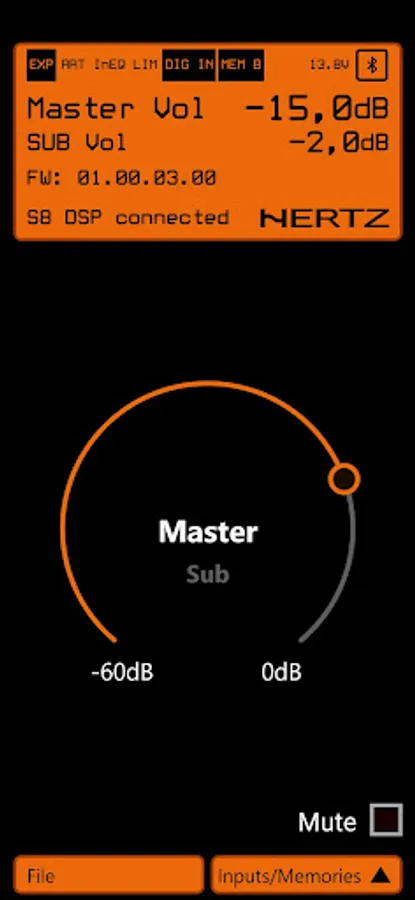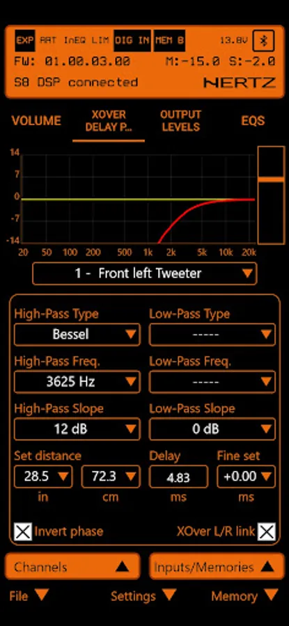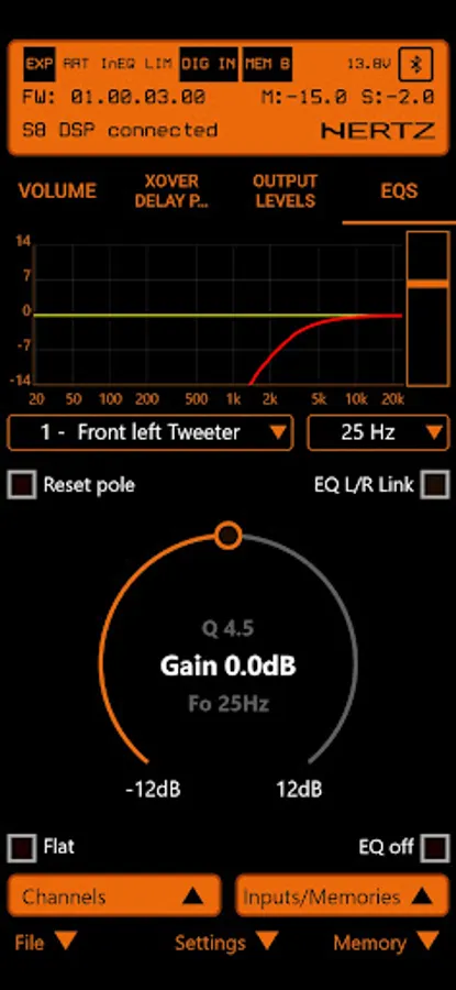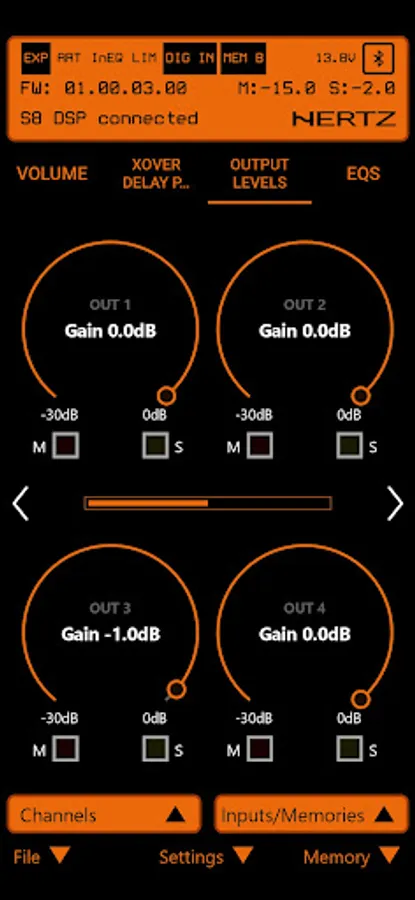 Through the S8 DSP mobile app you can use your Android mobile device to set up and command the complete S8 DSP device feature set via Bluetooth LE connection. S8 DSP mobile app offers two remote control modes: DRC or CONFIGURATOR. DRC mode allows to control basic DSP functions like memories, master volume, subwoofer volume and input selection. The CONFIGURATOR mode offers a clear user interface for controlling all the S8 DSP device features. Using the APP in OFFLINE mode you can create/simulate a new setup file or load a setup file already stored in your device. Then you can make the adjustment and save it again or upload that setup file into the S8 DSP device once a BT connection is estabilished.