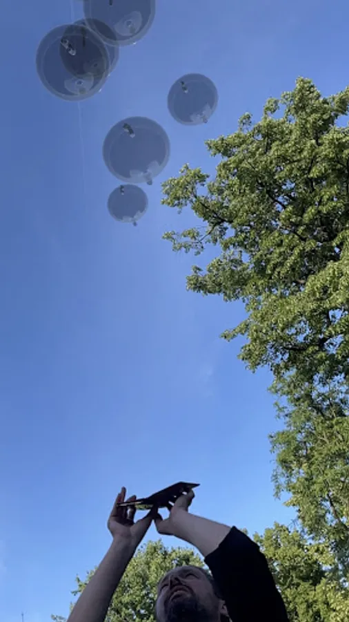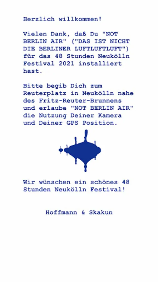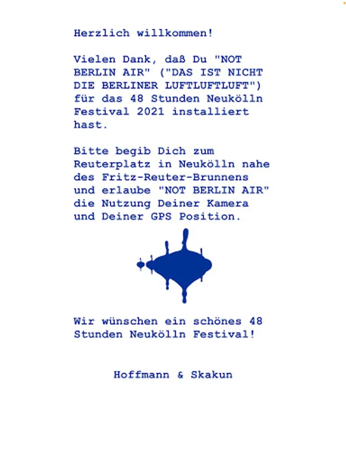 Simply install the Android app “NOT BERLIN AIR”. After activating the camera, simply touch and drag on your camera image to start the performance. Make sure that “NOT BERLIN AIR” can recognize flat surfaces and that the scene is sufficiently illuminated to position the installation.