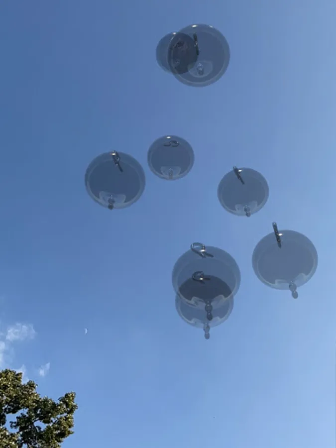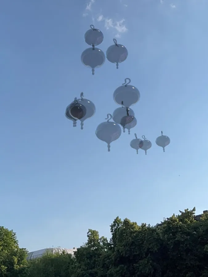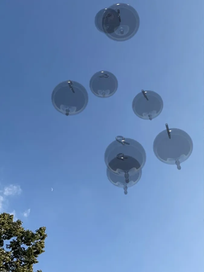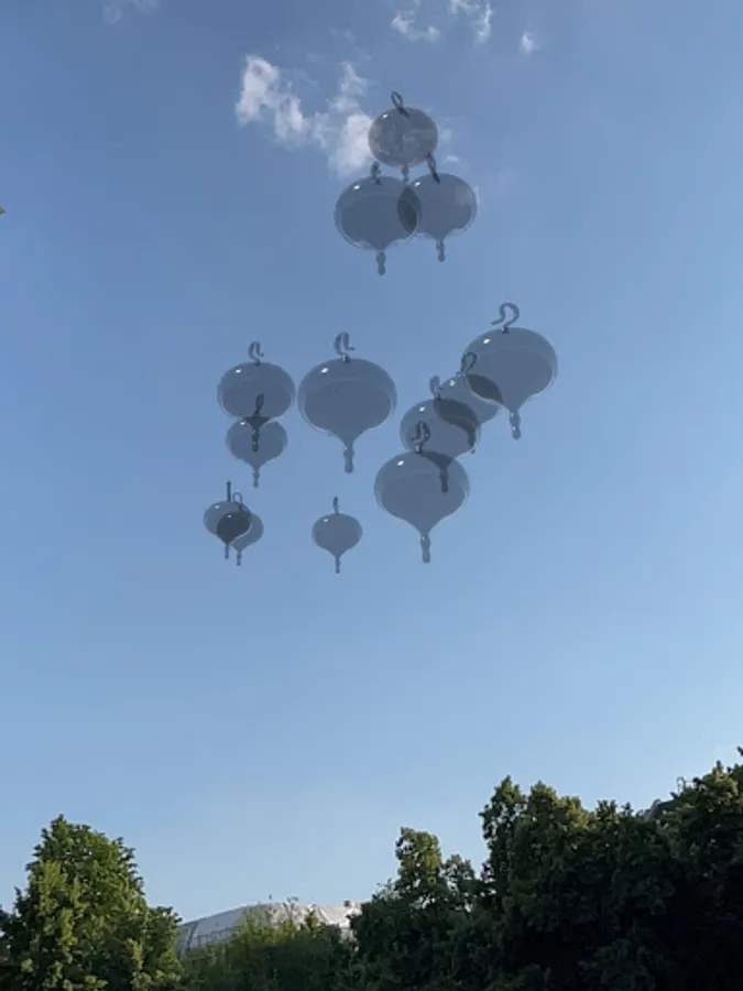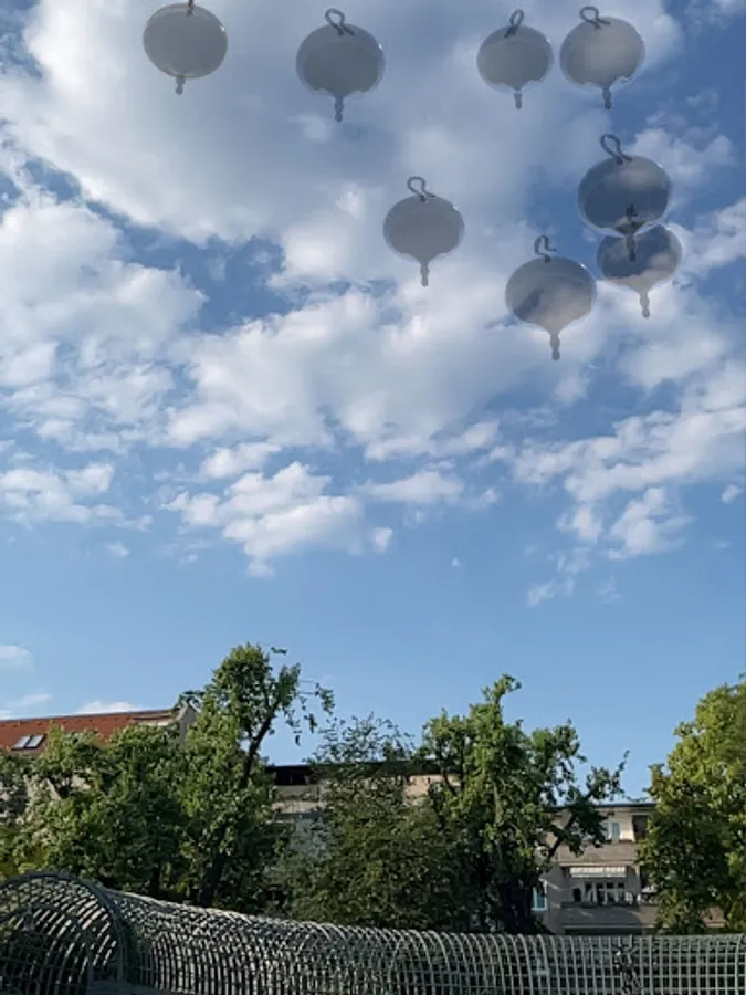 In an era of scarcity of pure and clean air, Hoffmann & Skakun produce their own and let them float in oversized glass ampoules in front of and above the heads of the beholder. The ampoule of the Duchampian readymade “50cc air de Paris” becomes a Calder mobile in a serial multiplication. Always in motion, as if gently pushed by an imaginary breeze, the bottle-like vessels give the appearance of a dance or the staging of a ballet piece. Its transparency and fragility, the play of inside and outside, of reality and fiction and then reality again acts as a bridge for viewers and virtual reality.