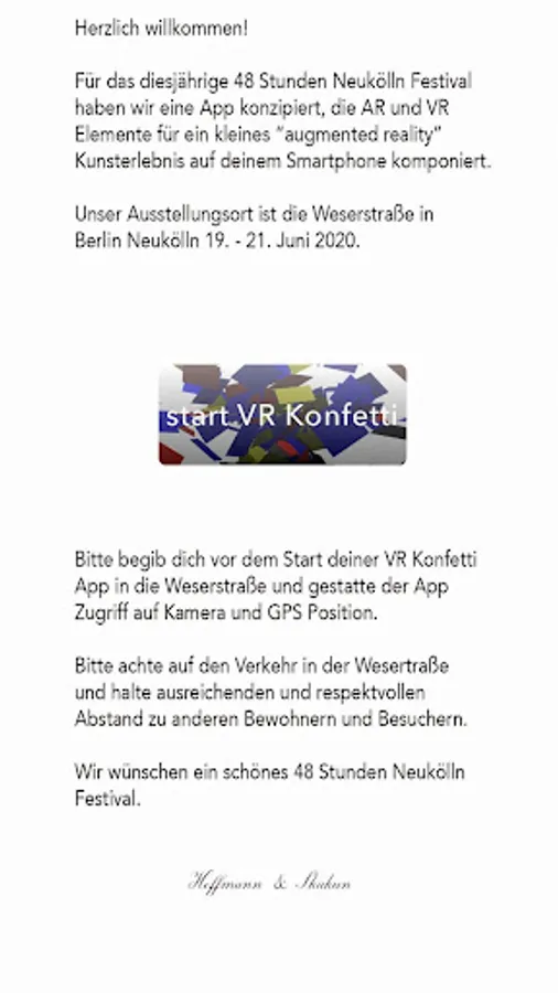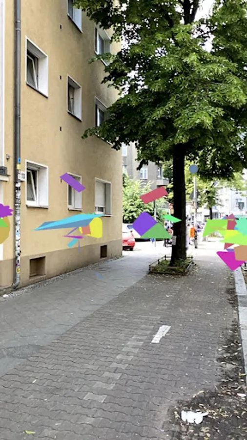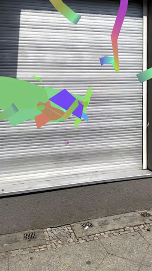 The recipient walks through Weserstrasse, a central exhibition location of the festival, and on the display of his end device he sees how things symbolically turn into confetti. VR Confetti is intended to give an image of the immediacy and dynamism of this process of socio-cultural bursting with the help of augmented reality. In this case, we do not understand VR as a virtual reality, but as a People's Republic or even more as a Community Republic. People's Republic of Confetti is the reference to social fragmentation due to economic change; humorous, but clear. The application itself is not a game. As an artistic work, it stands for itself and follows the spirit of performance and expanded sculpture. We want to initiate an art-scientific discourse to legitimize new technologies as art or to force an arrangement as a pure art object. VR confetti should serve as inspiration to open the doors to other art applications and to establish the art category, which is not available in the app stores.