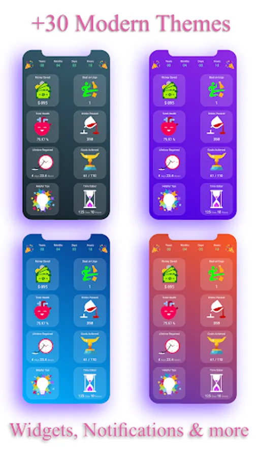 ★ Two awesome widgets to put on your home screen and always see the money you saved by quitting drinking and your time as an alcohol free person.