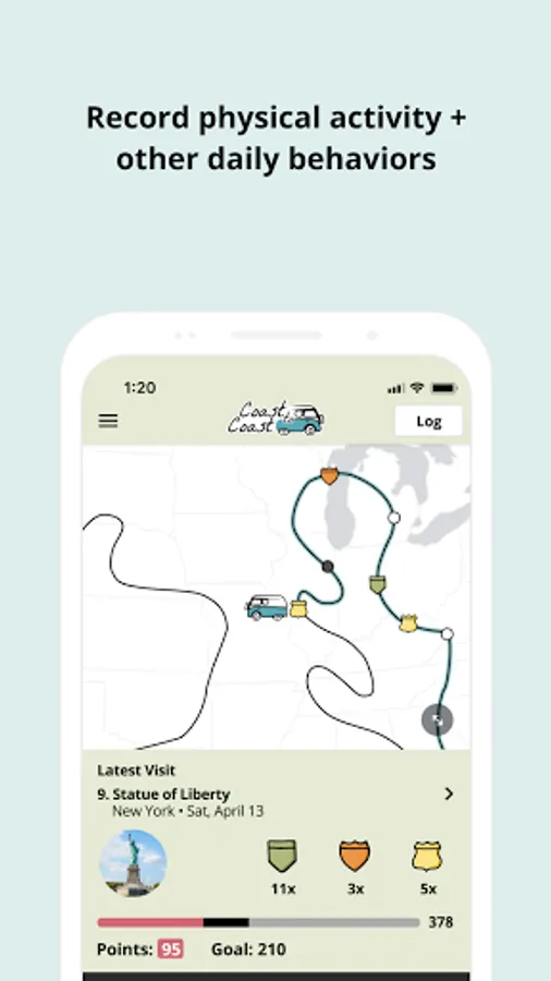 • Travel across the US, stopping at the country’s most exciting hot spots as you record healthy behaviors