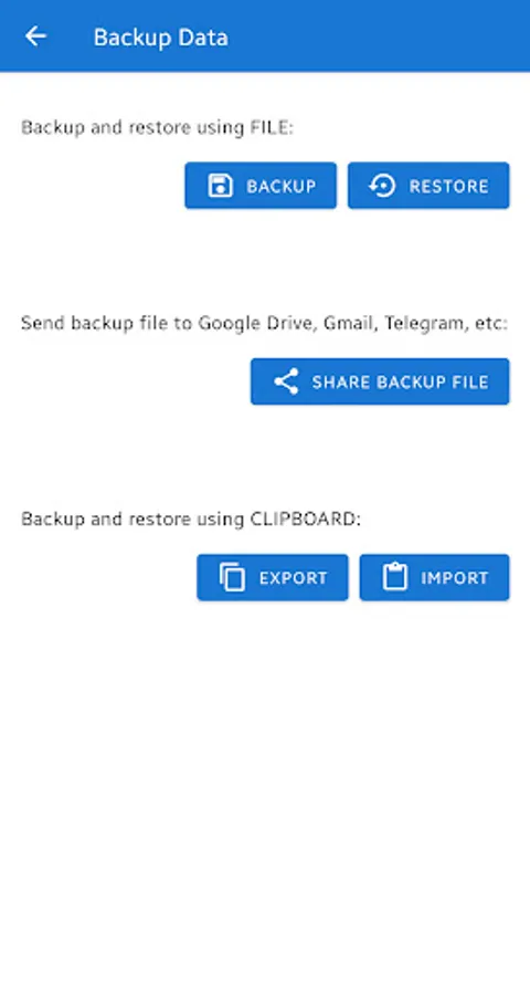 - Three ways to back up your data (export file to storage, share file to any social app and clipboard)