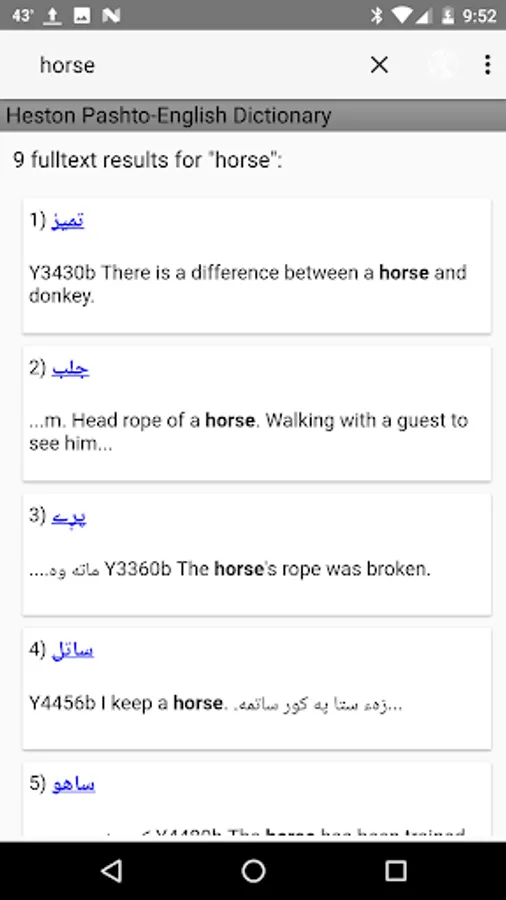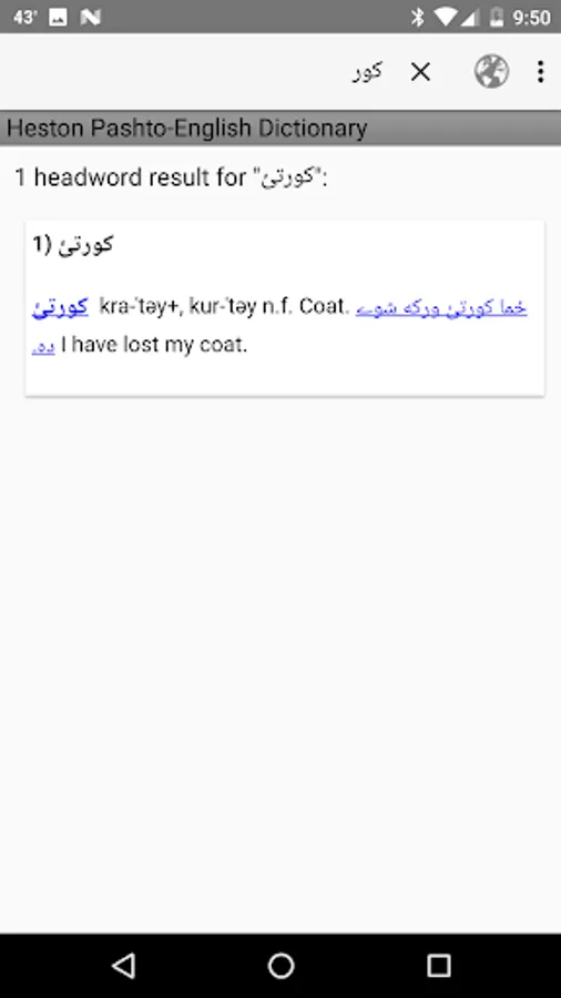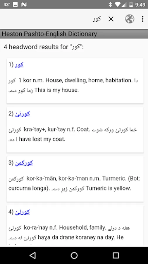 Heston Pashto-English has audio files so that the user can listen to examples of pronunciation. All headwords are linked to audio files. Definitions often contain usage example sentences, some of which are also linked to audio files. In online mode, the user can touch the highlighted word or sentence to stream the audio. In offline mode, headword audio is available, but example sentence audio is not.