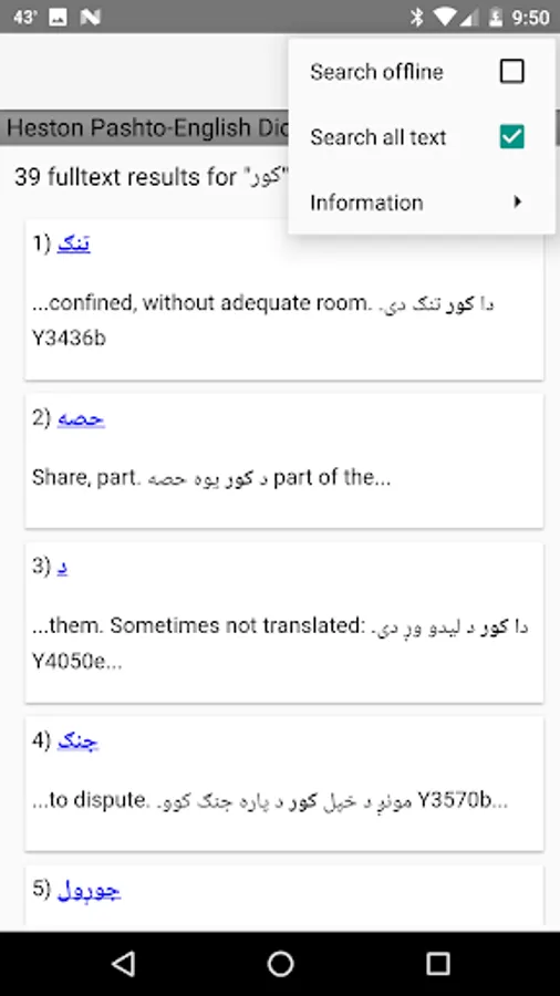 Heston Pashto-English allows users to conduct both headword and fulltext queries.