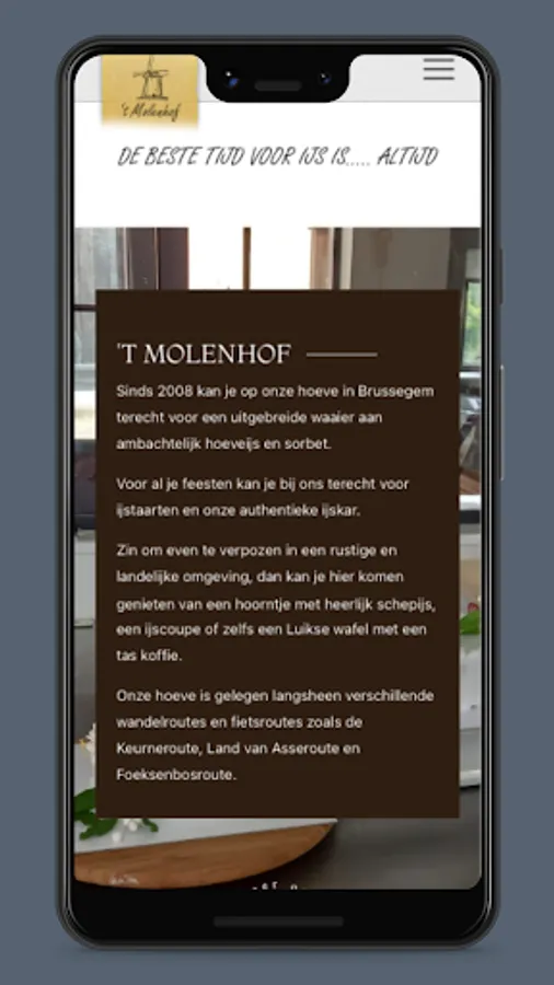 Sinds 2008 kan je op onze hoeve in Brussegem terecht voor een uitgebreide waaier aan ambachtelijk hoeveijs en sorbet. Voor al je feesten kan je bij ons terecht voor ijstaarten en onze authentieke ijskar. Zin om even te verpozen in een rustige en landelijke omgeving, dan kan je hier komen genieten van een hoorntje met heerlijk schepijs, een ijscoupe of zelfs een Luikse wafel met een tas koffie. Onze hoeve is gelegen langsheen verschillende wandelroutes en fietsroutes zoals de Keurneroute, Land van Asseroute en Foeksenbosroute.