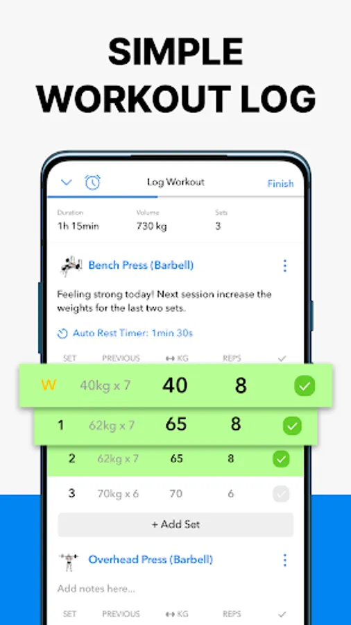 • Easily see your previous lift values, this helps you with progressive overload in your training, and will help you lift heavier over time.