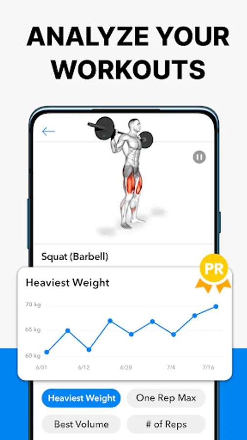 • Analyze the progression of your lifts with beautiful full-screen graphs of volume, best weight & total reps