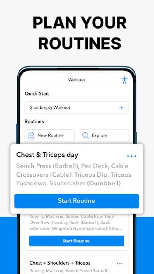 • Track your routines like 3 day workout split, full body split, bodybuilding routines, 5x5, upper lower, and push pull legs.