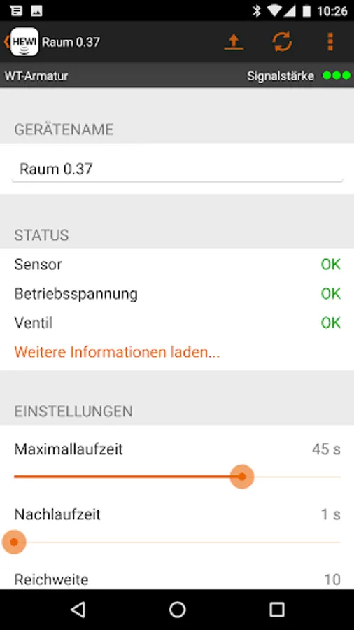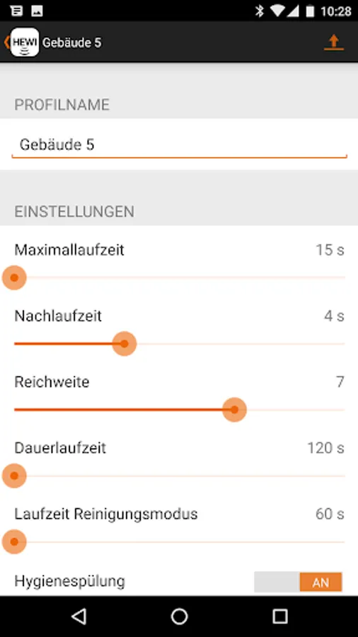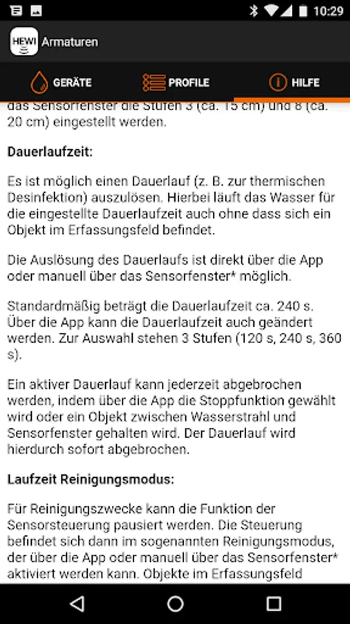 With the HEWI Service App, the HEWI SENSORIC fittings are particularly easy to maintain. The app enables simultaneous hygiene flushing with all installed SENSORIC fittings. In addition, settings, such as water running time, can be controlled synchronously with the service app. The HEWI Fittings App enables simple control of water consumption and user frequency.