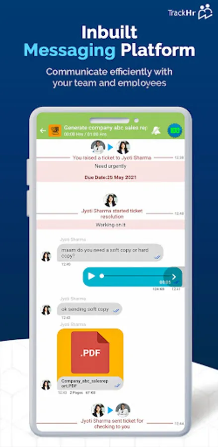 Track HR enables the sharing of information regarding the organisational tasks and operations, text messages, details, ,reports, images, etc. , all on a single platform and a click away. It helps self organises each flow of information associated to a specific task be communicated and viewable to the authorized persons of that particular task only. No need to manage the groups or making chains to flow the info anymore. Each task manages its information within itself and alerts the respective persons automatically, screening out all unnecessary notification and unauthorised access.