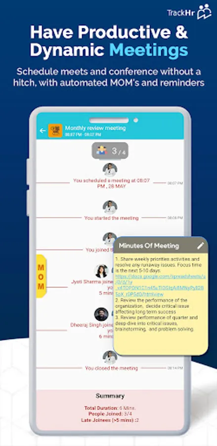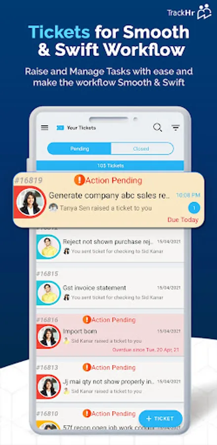 TrackHr as a platform, combines the functionality of an easy one click Key Responsibility Area (KRA) allocation , trouble ticket creation & monitoring , team meeting planner and right-on-time reminders and alerts to each resource to cut on the communication delays and gaps in the organisation. No need to invest time into texting ,calling or personally communicating the work any more, but investing more time into focusing on doing the work.