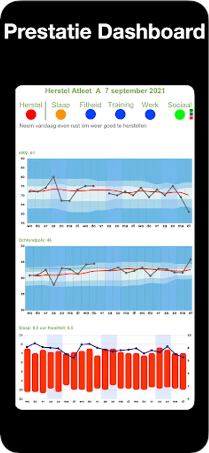 HRV (Heart Rate Variability) measures the difference between the time of subsequent heart beats (R-R times). It is well documented that a low HRV corresponds with a high stress reaction. On the other hand a very high HRV is an indication of overreaching (the reality is a bit more complicated). Especially trends over a longer period of time are a good indication of training effect.