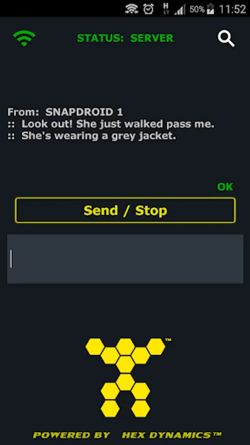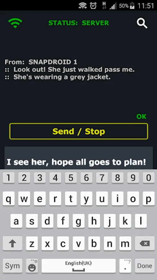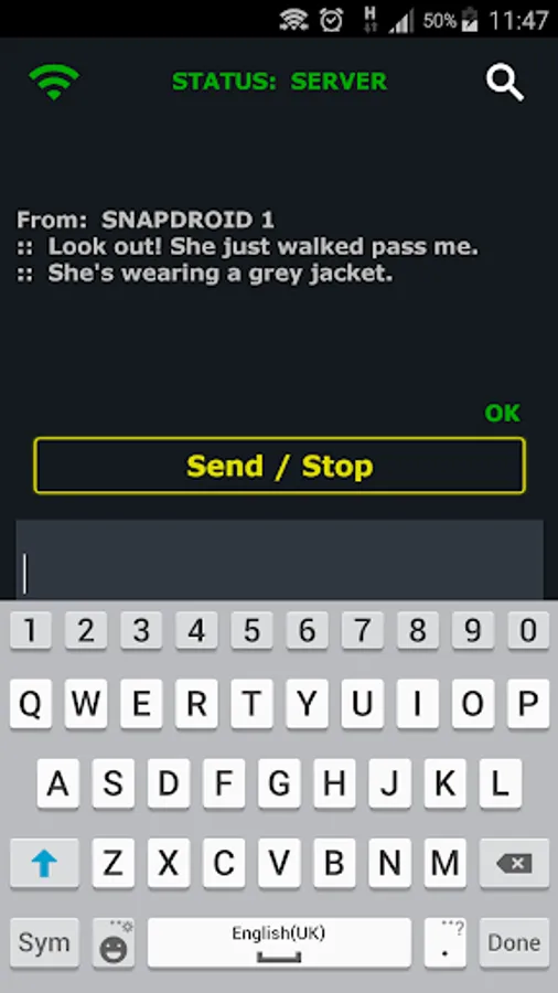 After each send, an "OK" indicator will appear at the top of the Send button as confirmation if the last message was delivered successfully.