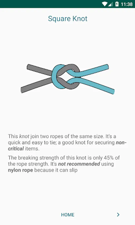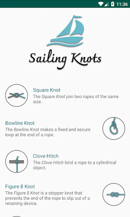 It's completely advertisement free and includes the knots: Square Knot, Bowline Knot, Clove Hitch and Figure 8 Knot, Cleat Hitch, Anchor Hitch, Marlinespike Hitch, Rolling Hitch, Stevedore Knot, Sheet Bend, Scaffold Knot, Monkey’s Fist, Blood Knot and Highwayman's Hitch.