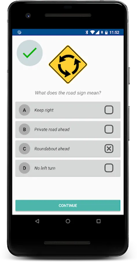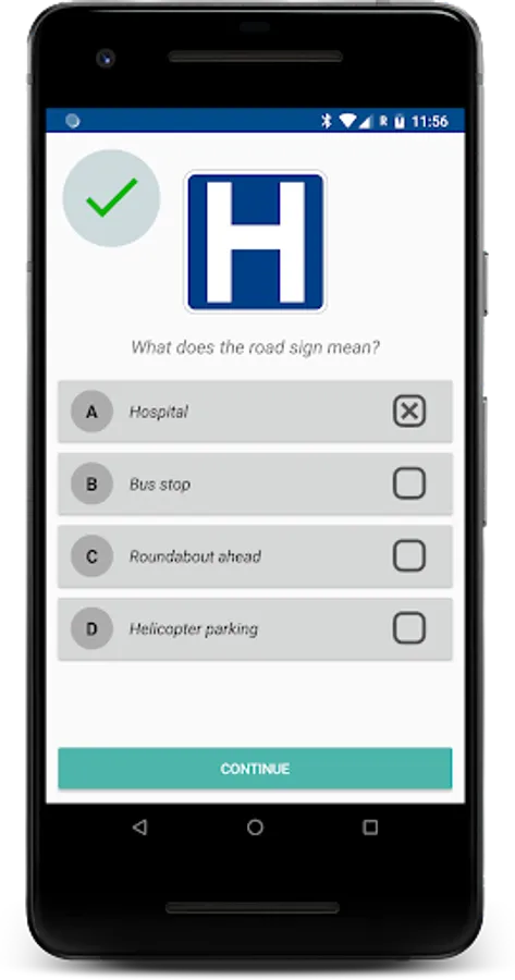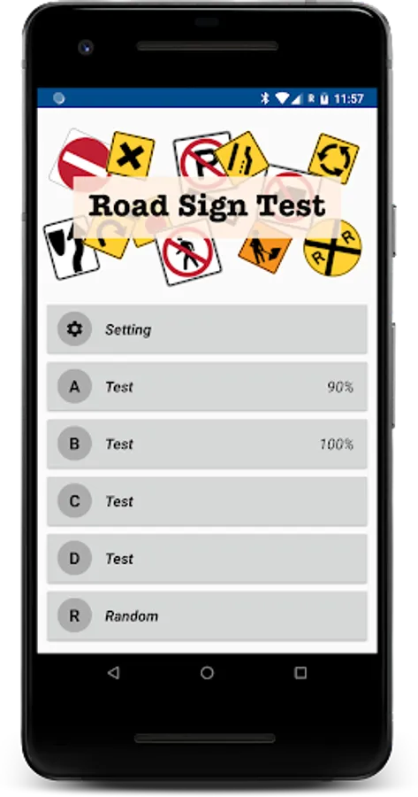 In both case, this app will help you to learn and memorise the traffic and road signs. You will be given a picture of a sign with four answer to choose from.