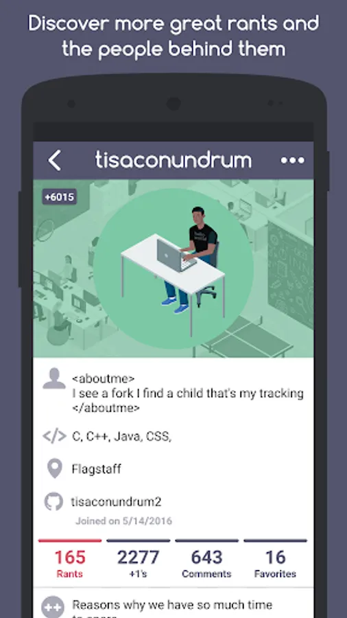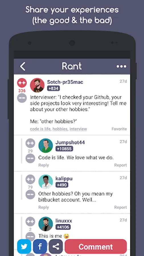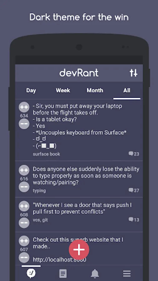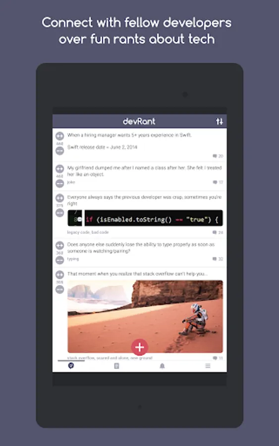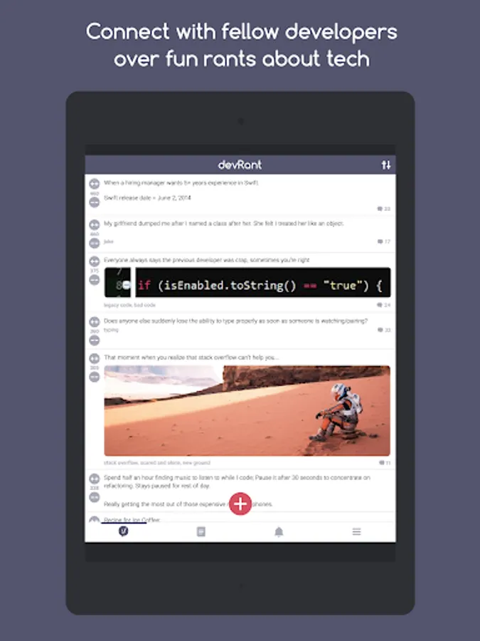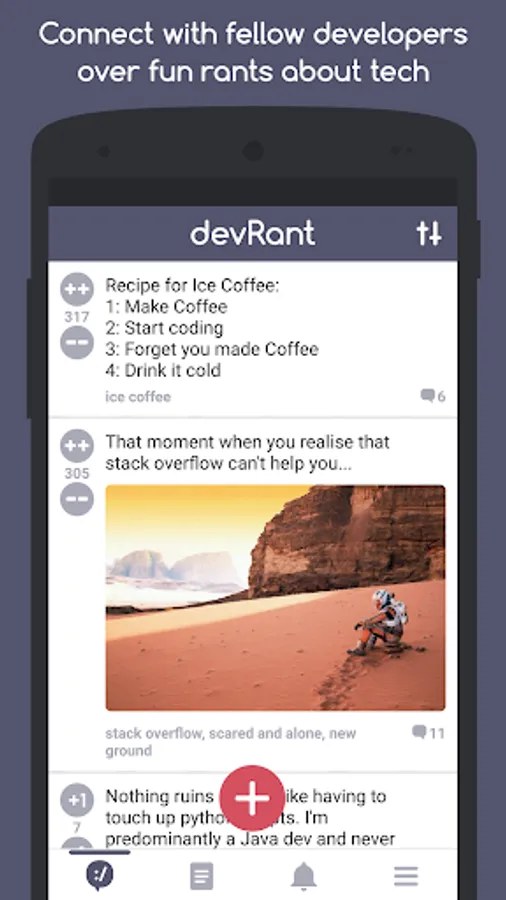 devRant is a fun community for developers to share and bond over their successes and frustrations with code, tech, and life as a programmer!