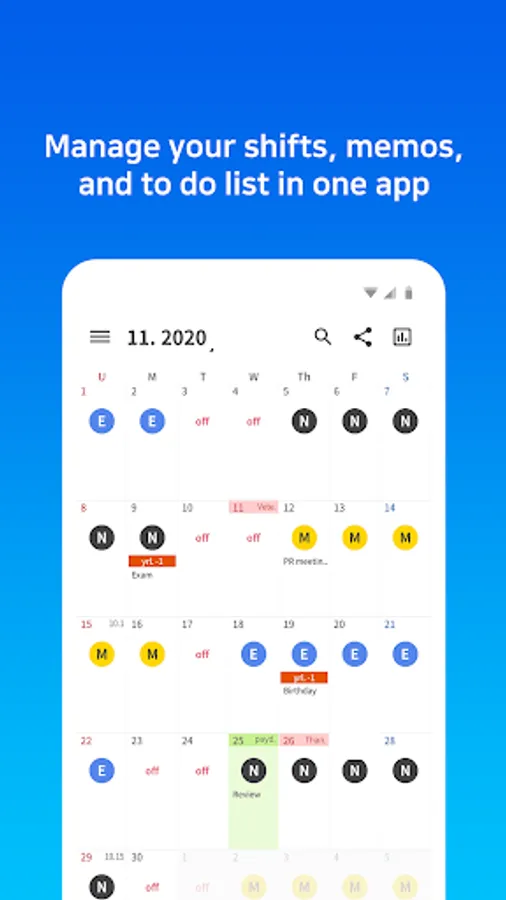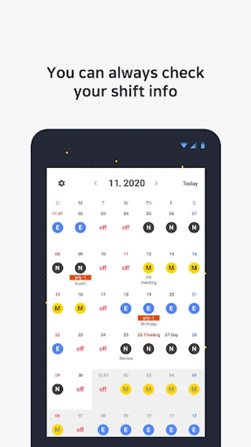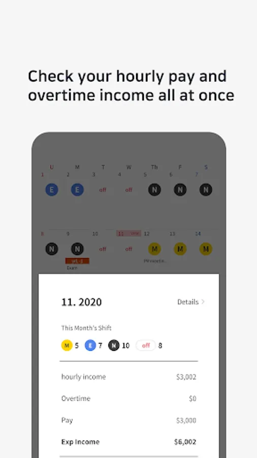 View all the information you need for your shifts (e.g. working hours, monthly salary, other income, overtime, holidays, attendance, annual leave, etc.) all at once!
